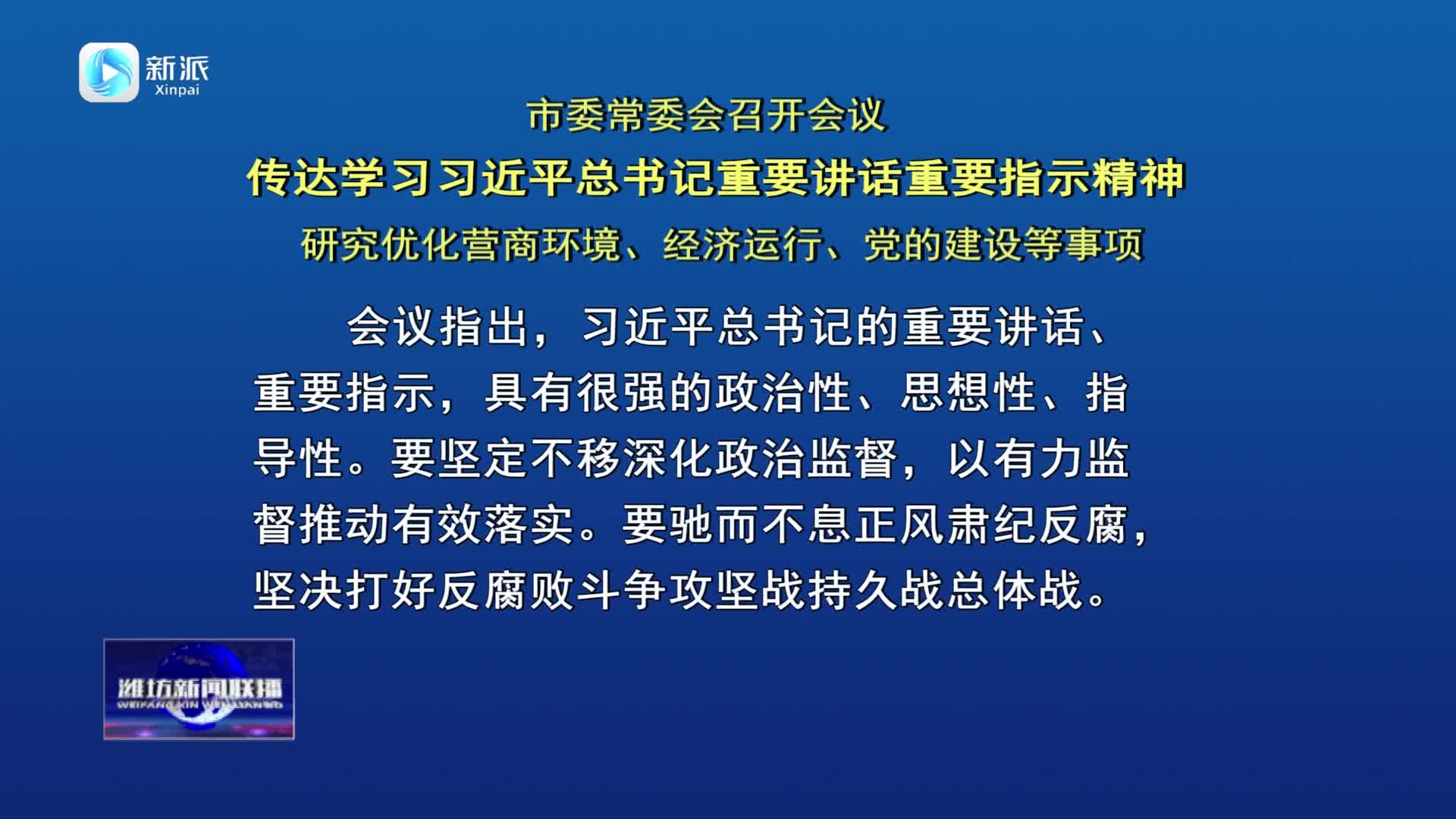 【濰坊新聞聯(lián)播】市委常委會(huì)召開會(huì)議 傳達(dá)學(xué)習(xí)習(xí)近平總書記重要講話重要指示精神 研究?jī)?yōu)化營商環(huán)境、經(jīng)濟(jì)運(yùn)行、黨的建設(shè)等事項(xiàng)