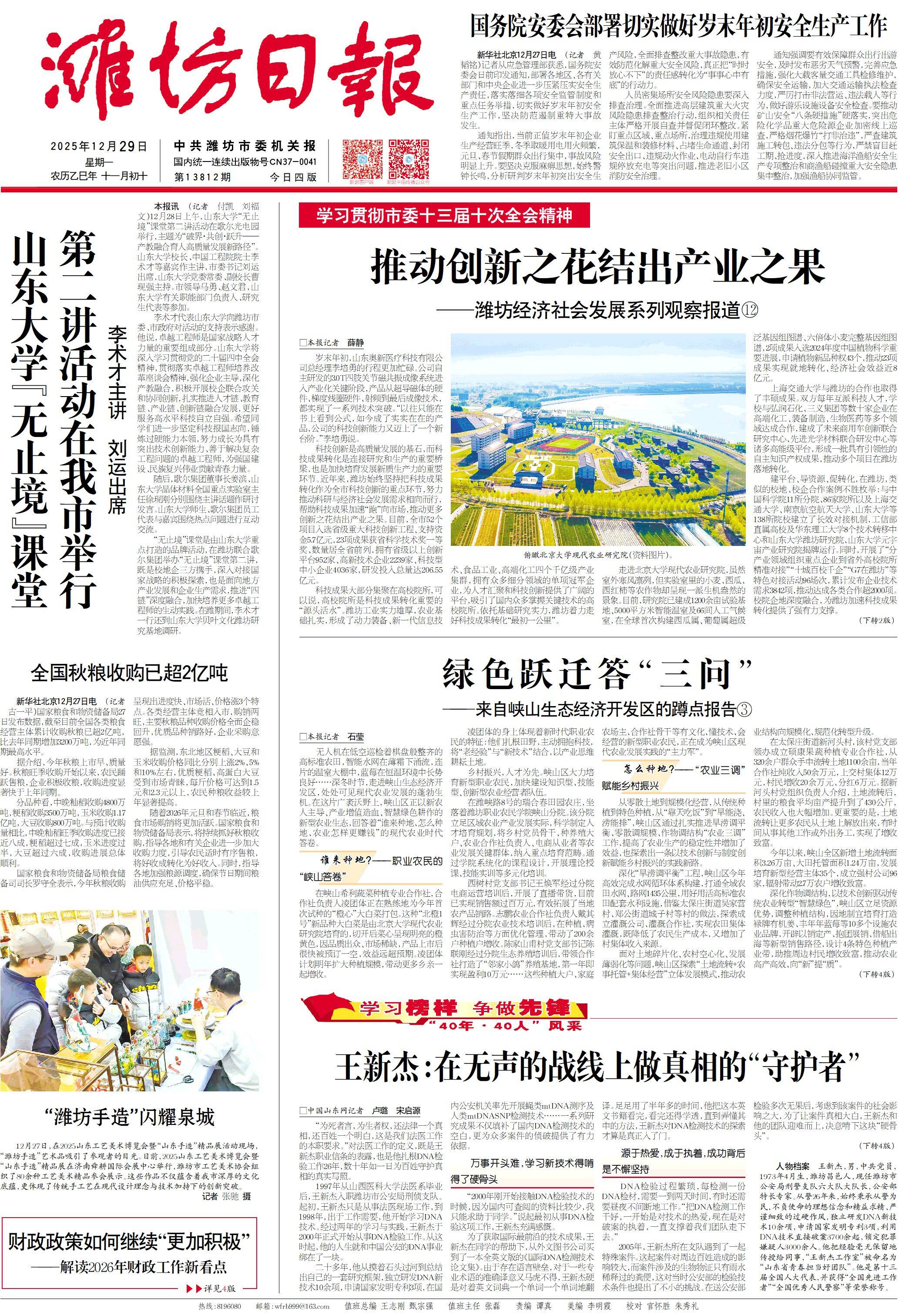 編者按 中共濰坊市委十三屆十次全會高度評價“十四五”時期濰坊發(fā)展取得的歷史性成就,明確了“十五五”時期濰坊經(jīng)濟(jì)社會發(fā)展的主要目標(biāo)?!笆逦濉睍r期是濰坊跨越萬億、提質(zhì)增效、高水平建設(shè)區(qū)域副中心城市的重要?dú)v史時期,實(shí)現(xiàn)“十五五”時期的奮斗目標(biāo),是全市人民追求美好生活的熱切期盼,也是需要我們高質(zhì)量完成的時代命題。為展現(xiàn)濰坊奮進(jìn)萬億城市、勇挑發(fā)展大梁的堅(jiān)實(shí)基礎(chǔ)與發(fā)展動能,濰坊市融媒體中心在濰坊日報(bào)、新派客戶端同步推出“濰坊經(jīng)濟(jì)社會發(fā)展系列觀察報(bào)道”,在盤點(diǎn)2025中提振發(fā)展信心,在展望2026中開啟強(qiáng)市新程。